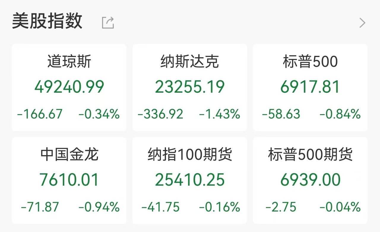 当地时间2月3日,美股三大指数集体走弱。道琼斯工业平均指数下跌0.34%,报49240.99点;标普500指数跌0.84%,报6917.81点;纳斯达克综合指数跌1.43%,报23255.19点,几乎完全回吐了年初以来的涨幅。科技巨头表现尤为疲软,微软、英伟达跌近3%,Meta跌超2%,亚马逊、谷歌均下跌超1%。