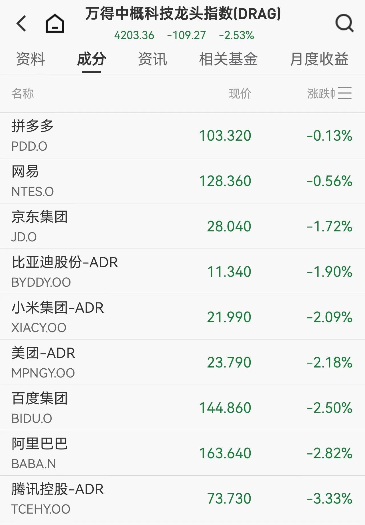 中概股方面,纳斯达克中国金龙指数收跌0.94%。阿里巴巴、百度跌超2%,京东、爱奇艺跌超1%;但小鹏汽车涨超4%,理想汽车涨近3%,显示了新能源汽车板块的相对韧性。